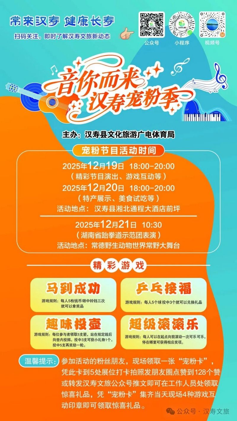 活动期间,文化演出与体育赛事将同步展开、相互呼应。“音你而来汉寿宠粉季”将于12月19日晚拉开序幕,演出节目涵盖架子鼓、流行演唱、街舞、拉丁舞等现代艺术,也融入了川剧变脸、三棒鼓、地花鼓等非遗展示,并设有孙悟空模仿秀、有奖问答等互动环节,呈现一场融合传统与时尚的文艺汇演。