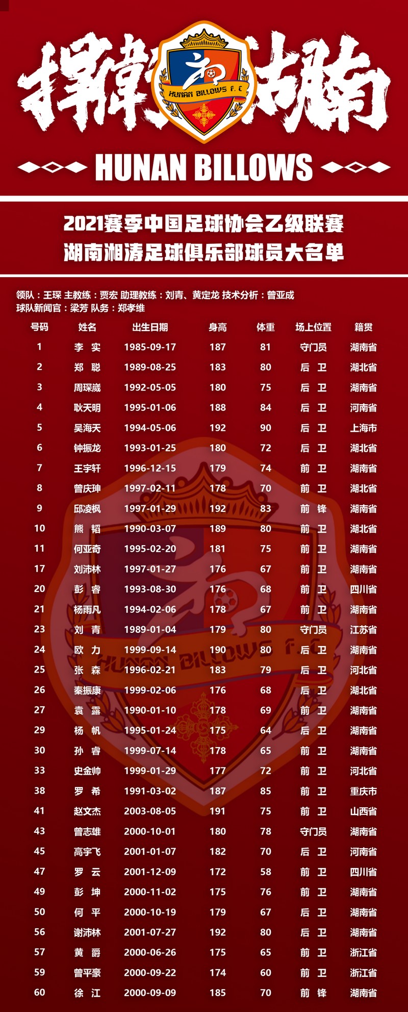 (湖南湘涛队2021赛季球队大名单。供图/湘涛俱乐部)