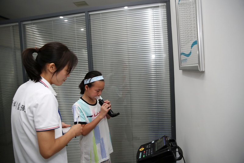 一位小朋友在工作人员的指导下进行肺活量测试。