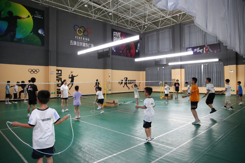 小朋友们正在羽毛球馆进行跳绳训练。