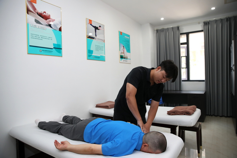 工作人员正在为参与体验的记者按压肩部。