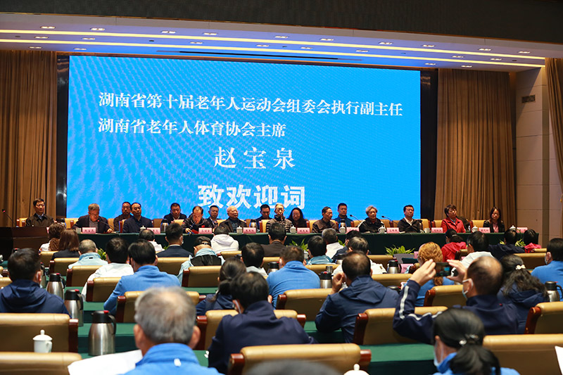 (图为湖南省老年人体育协会主席赵宝泉致欢迎词。)