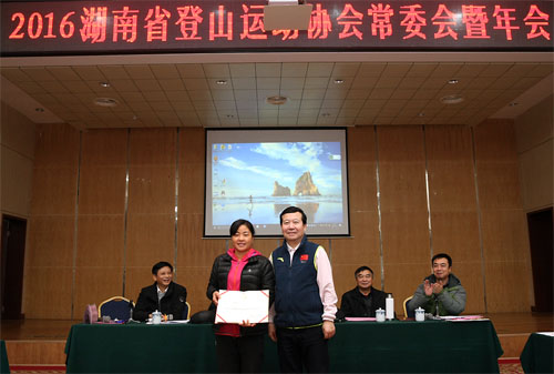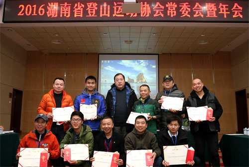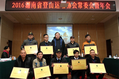 (图为省登山协会主席曹任远为“2016年度湖南省登山户外运动先进个人”颁奖并合影。)
