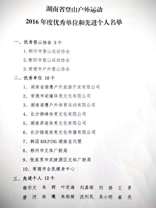 会上还表彰了一批先进,郴州市登山协会等3个协会被授予“2016年度湖南省优秀登山协会”,长沙御峰体育等10家单位被评为“2016年度湖南省登山户外运动优秀单位”;同时,我省岳阳登山爱好者谢尔文于2016年成功登顶珠穆朗玛峰,也成为我省第二位成功登顶世界最高峰的女性,她和朱辉等12位同志还被评为“2016年度湖南省登山户外运动先进个人”。