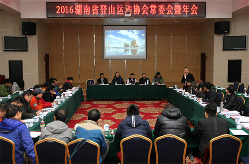 1月11日,2016年湖南省登山协会常委会暨年会在宁乡县阳光山庄召开。湖南省体育总会专职副主席冯湘江,省登山运动协会主席、省体育局原纪检组组长曹任远,省社会体育指导服务中心主任周光正、书记黄建明等领导及协会副主席、常务委员、各市州(教体、文体)局、登山协会、相关从业机构、商业合作伙伴等50余人参加了会议。