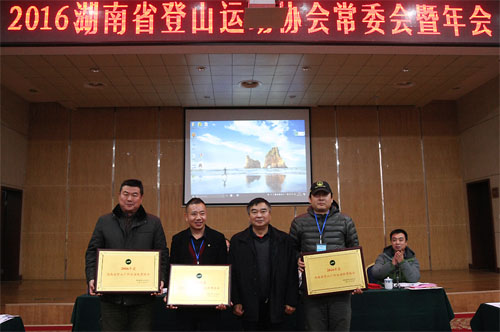 (图为省登山协会主席曹任远为“2016年度湖南省登山户外运动优秀单位”颁奖并合影。)
