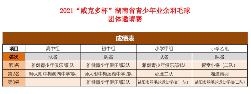 经过2天84场比赛的精彩角逐,最终雅健青少年俱乐部一队、雅健青少年俱乐部二队、雅健青少年俱乐部四队、智贲小将二队分获高中组、初中组、小学甲组、小学乙组冠军。湖南省羽毛球协会名誉副主席李贵、湖南省体育局青少年体育处处长肖方军、湖南省羽毛球协会副主席兼秘书长唐辉、湖南省羽毛球协会副秘书长曾正平及江苏威克多体育用品有限公司销售主任廖磊等领导嘉宾出席闭幕式并为获奖队伍颁奖。