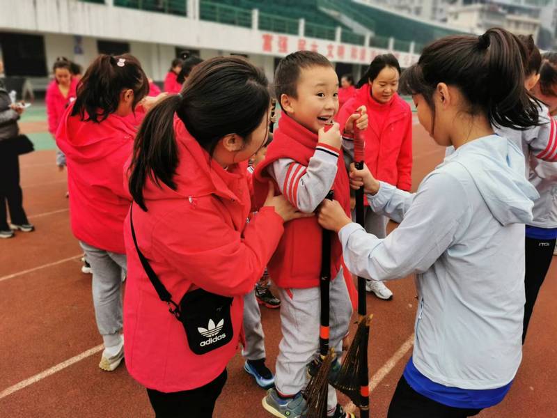 (该图为州幼儿园教师带领学生来该校体验高脚项目训练)