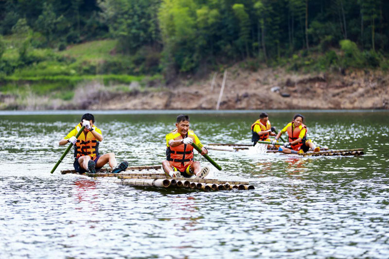 竹筏项目需要两人一组,划动船桨,到达湖对岸,不仅考验划船技巧还得要有速度,选手们在激烈的比拼中,穿越大熊山高峰湖绿盈盈的湖面,感受返璞归真的愉悦。