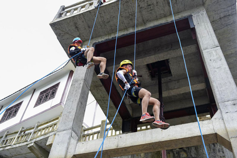桥降项目需要在教练的指导与保护下,利用绳索由桥上往下降,选手可以自己掌握下降的速度、落点,以到达地面。虽然并不需要严格的专业技巧,但选手们必须克服对高度、速度的恐惧,具备勇往直前、坚持到底的决心。