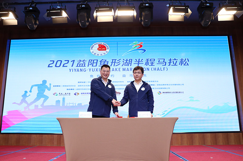 会上,省体育局竞技体育与科技处处长罗器宇、湖南体育产业集团有限公司党委副书记李武祥共同为赛事主题口号揭幕;省田径运动管理中心主任、省田径协会主席张连标、益阳东部新区工委委员、管委会副主任刘伟丰共同为赛事会徽揭幕;益阳市文化旅游广电体育局党组成员余正、益阳市两型建设投资集团有限公司党委书记、董事长莫跃良共同为赛事路线图揭幕。益阳东部新区工委委员、管委会副主任刘伟丰、湖南省体育国际旅游有限公司执行董事、总经理崔杰阳共同登台进行签约。