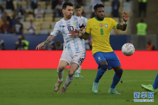 7月10日,阿根廷队球员梅西(左)与巴西队球员弗雷德在比赛中拼抢。新华社发(拉赫尔·帕特拉索摄)