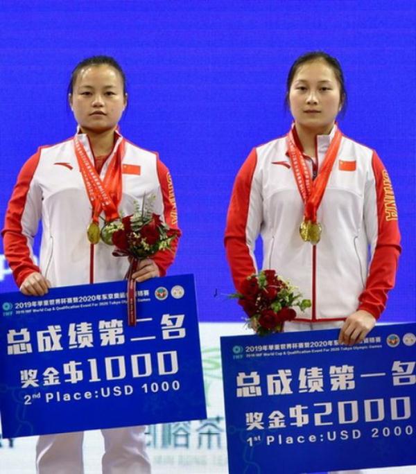 2月24日,廖秋云(右)和队友黎雅君在女子55公斤级颁奖台上。