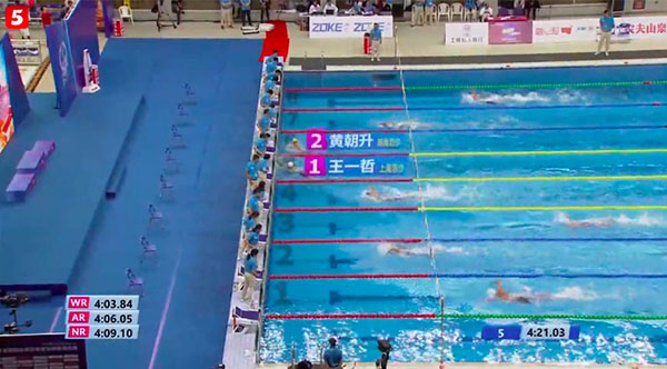(2019年全国游泳冠军赛男子400米混合泳,黄朝升获得亚军。视频截图)
