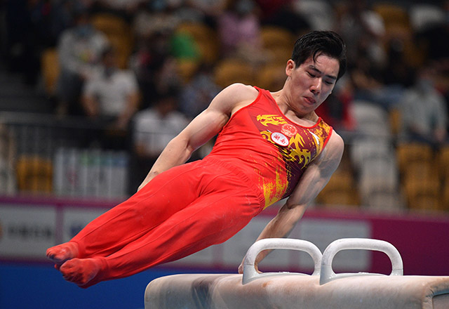 湖南队选手张博恒在鞍马比赛中。 唐俊摄