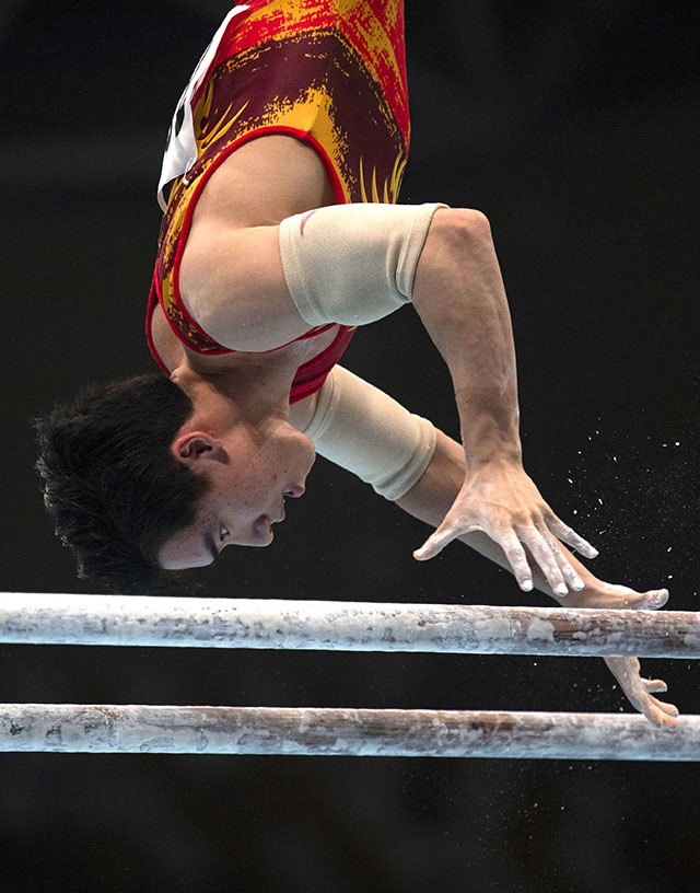 湖南队选手张博恒在双杠比赛中。 唐俊摄