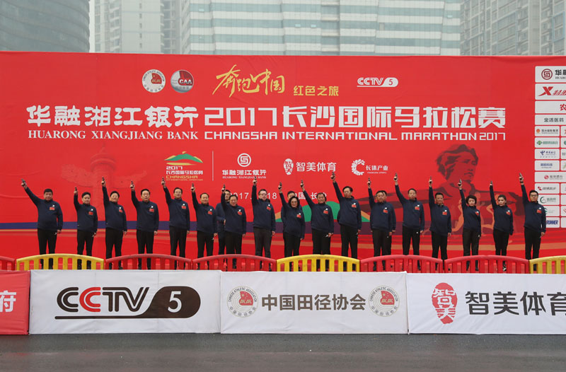 中国民族贸易促进会会长贺黎明、国家体育总局田径运动管理中心主任于洪臣、中央电视台副总编辑彭健明、湖南省体育局党组书记、局长李舜、长沙市委副书记、市人民政府市长、湖南湘江新区党工委书记陈文浩、长沙市委副书记徐宏源、长沙市人大常委会主任程水泉、长沙市政协主席文树勋、长沙市委常委、宣传部部长高山、长沙市人民政府副市长、市公安局党委书记、局长唐向阳、长沙市政协副主席、市体育局局长李平、湖南湘江新区党工委委员、管委会副主任罗社辉、智美体育集团董事局主席任文、华融湘江银行行长蒋俊文、特步(中国)有限公司集团总裁特别助理、品牌管理中心高级总监王强、射击奥运冠军中国奥委会专家委员会委员王义夫、国家体育总局田径运动管理中心马拉松办公室主任水涛、及长沙市直相关部门、天心区负责人等领导和嘉宾参加了起跑仪式。