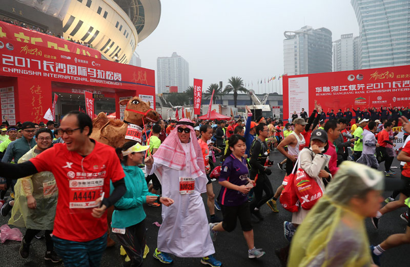 11月18日上午,“奔跑中国·红色之旅”华融湘江银行2017长沙国际马拉松赛在贺龙体育中心鸣枪开跑。来自国内外2万余名跑步爱好者聚首长沙、在绵绵细雨中激情奔跑。