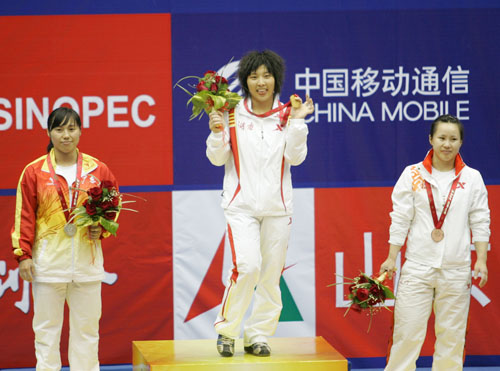 图为湖南选手李萍(中)获得举重53公斤级冠军