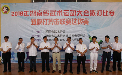 为了更好地促进我省武术散打搏击运动的发展,提升我省武术散打搏击技术水平,由湖南省武术协会主办的2016年湖南省武术运动大会散打比赛暨散打搏击联赛选拔赛,于6月4日至5日在湖南司法警官职业学院隆重举行。共有来自全省各武术协会、大专院校、武术馆校、俱乐部、门派拳种研究会等28支代表队的260名运动员参赛。