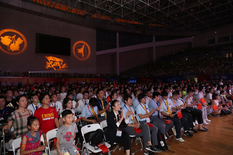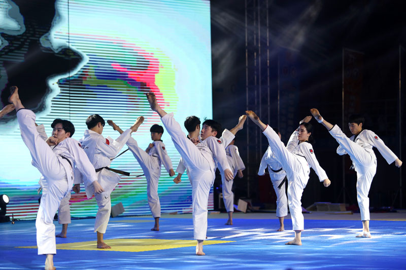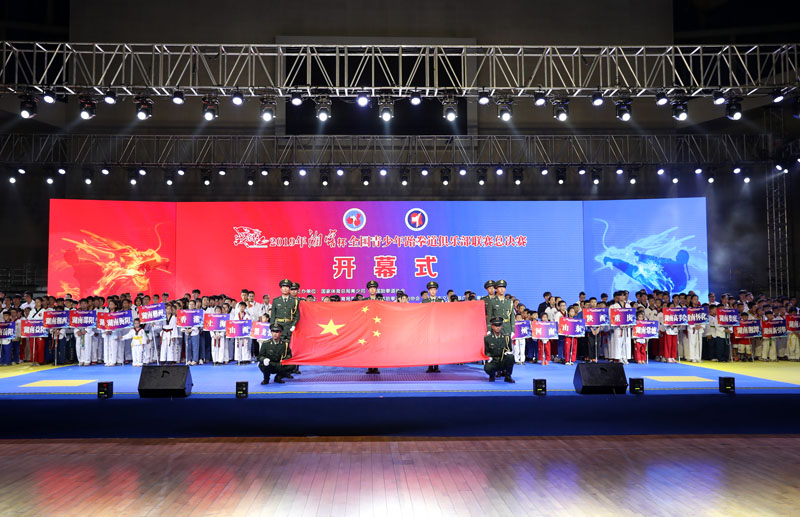 开幕式上,当《我和我的祖国》优美音乐在宏伟的体育场七个方向以快闪方式唱响,寓意祖国70周年生日快乐,带动全场万人齐声高歌“我爱我的祖国”,稚嫩的童声,欢乐的笑脸,现场气氛瞬间爆燃。接着国旗护卫队八名持旗手,他们擎着鲜艳的五星红旗,迈着整齐的步伐,坚毅的眼神,震撼了全场。伴随慷慨激昂的乐曲,本次比赛的裁判员队伍以及代表全国18个省市自治区的35支代表团方阵依次入场。在礼仪的引领下,各代表团旗手挥舞团旗,运动员们绽放笑容,大步走入会场,展现出跆拳道运动员阳光向上、朝气蓬勃的精神面貌。接下来,全体起立,奏唱中华人民共和国国歌,高亢嘹亮的国歌声响彻整个体育馆。