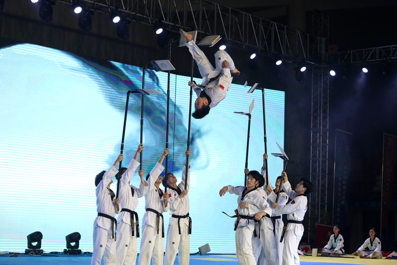作为热情好客的东道主,湖南师范大学的舞狮队热闹开场,广邀来自五湖四海的朋友做客潇湘,省歌舞团高音歌唱家张芝明演唱了经典民歌《浏阳河》,表达了湖南人民对家乡的热爱和对美好生活的向往。压轴嘉宾是韩国的世界跆拳道联盟示范团,潇洒动感的出场即赢得观众阵阵欢呼,高空腾跃的特技动作震撼人心,刚柔并济的跆舞表演尽情展示了跆拳道运动的精彩魅力,其特别为献礼中国七十周年设计的舞美编排,表达了韩国同仁祝福我国国庆的友好情谊。