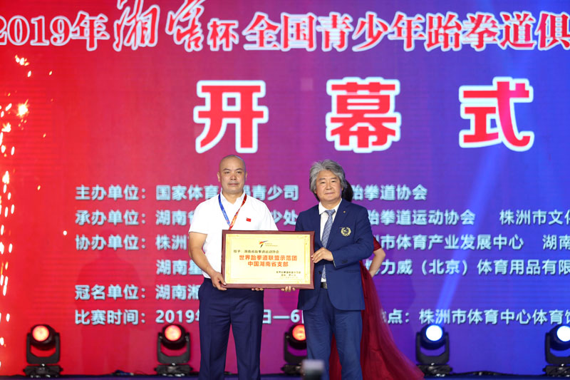 在开幕式上,世跆联示范团团长罗一汉和湖南省跆协副主席兼秘书长王卫华互相授赠牌匾,湖南省跆拳道运动协会被授予世界跆拳道联盟示范团中国湖南省分部,对罗一汉团长促进中韩两国体育交流和为湖南跆拳道发展作出的卓越贡献,省跆协表示衷心感谢并回赠感谢牌。