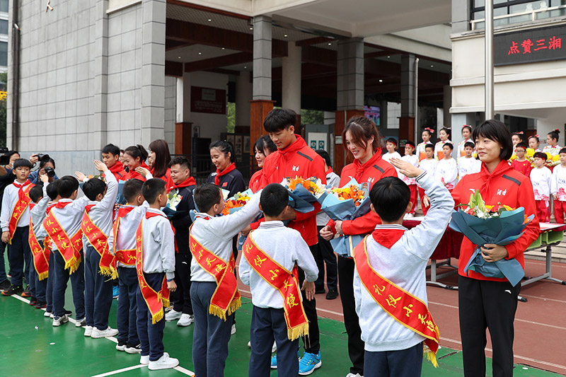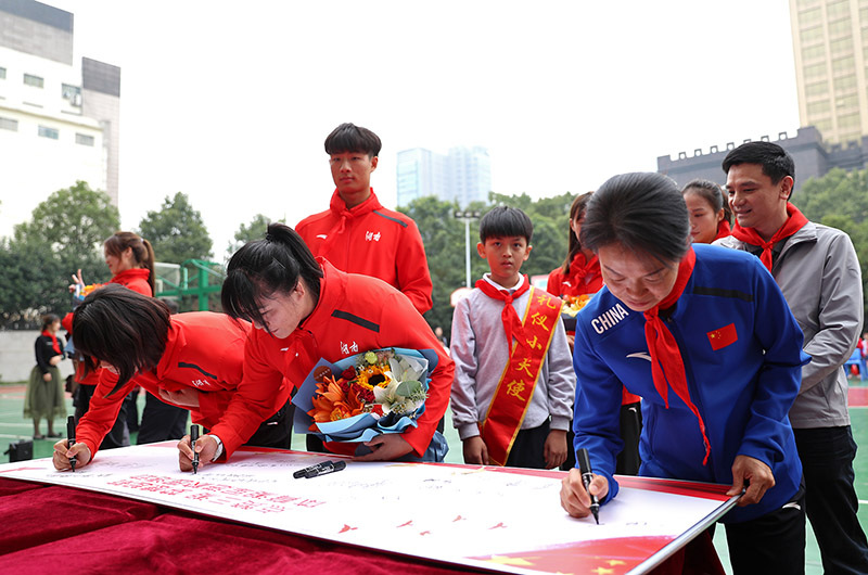 龙清泉、田卿、黄瑰芬、龙金宝、熊敦瀚、周倩、张驰、向若鸣、彭姗等9名湘籍体育冠军的到来,不仅给孩子们送上了专业的指导,还送上殷切的祝福与题词。