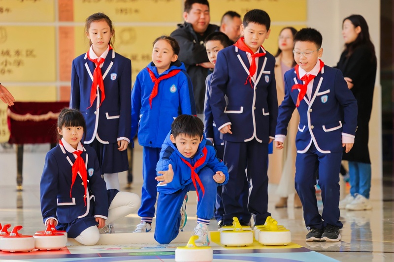 活动现场,主办方精心打造的临时“陆地冰场”成为校园里最具人气的打卡地,四周整齐排列的奥林匹克图片展与装饰将校园一角幻化成冰雪乐园。旱地冰壶体验区、短道速滑体验区等多个功能板块,满足了同学们对冰雪运动项目的好奇与探索欲。