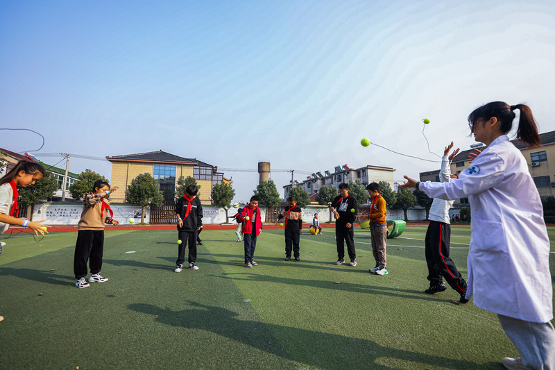 2023年11月23日,浙江省湖州市吴兴区东林镇卫生院志愿者在东林二小教导学生通过视力训练球游戏舒缓眼睛压力。