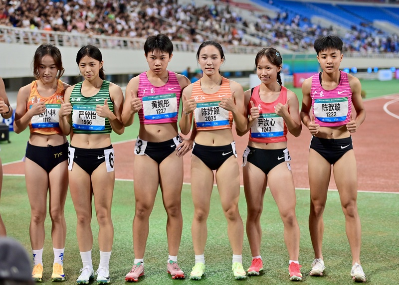 8月11日,参赛选手在赛后合影。当日,第一届全国青少年田径运动会女子100米决赛在沈阳举行。