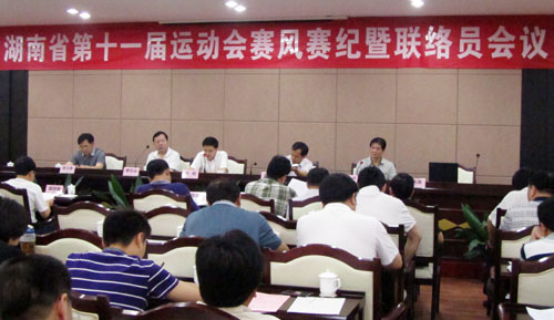 2010年6月27日上午,湖南省第十一届运动会赛风赛纪暨联络员会议在湘潭市隆重举行。会议由省十一运会竞赛部部长陈正培主持,会上有湘潭市副市长、省十一运会执委会副主任苏健全发表了热情洋溢的讲话;省体育局副局长、省十一运会执委会常务副主任熊倪作了重要讲话,还有相关的同志对竞赛工作、赛风赛纪工作、兴奋剂检测工作等作出了安排部署;最后由省体育局纪检组长、省十一运会执委会副主任曹任远受省体育局局长的委托与各市州代表团团长签订省十一运会赛风赛纪责任书,传达了体竞字[2010]75号《关于加强各省(区、市)运动会赛风赛纪和反兴奋剂工作的通知》,并作重要讲话。