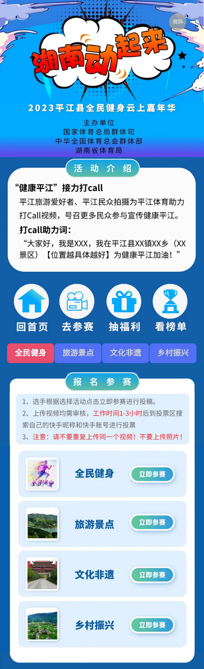 本次活动将面向全国平江旅游爱好者、平江县域内城乡居民、平江县各中小学学生、体艺培训机构/俱乐部、企事业职工等群体,参赛视频作品的拍摄不限时间、地点和场景,并将参赛视频上传至快手平台+湖南省体育云动会平台即可参赛。