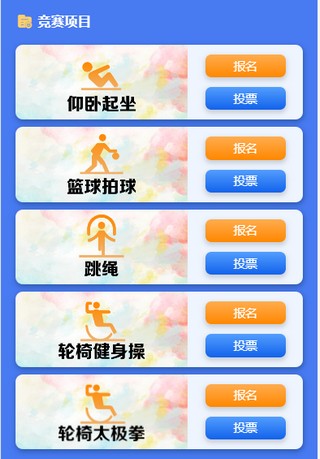 本次残疾人健身周云竞赛为了让更广泛残疾人能参赛,项目设置简单、大众化、参赛门槛低。根据竞赛规程,活动设个人竞技和集体展演两个类别。其中,个人竞技项目主要以“1分钟云竞赛”开展,包括仰卧起坐(听力组、视力组、智力组)、篮球拍球(轮椅组、听力组、智力组)、跳绳(听力组、智力组)3个项目。