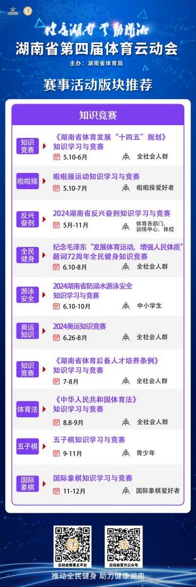 为宣传普及体育领域相关法律法规规划,由湖南省体育局主办的湖南省第四届体育云动会“我是答题王”体育和健身类知识竞赛系列活动(线上)将于5月10日启动,第一批上线的是《湖南省体育发展“十四五”规划》知识学习与竞赛、《湖南省啦啦操运动知识学习与竞赛》等两个项目。
