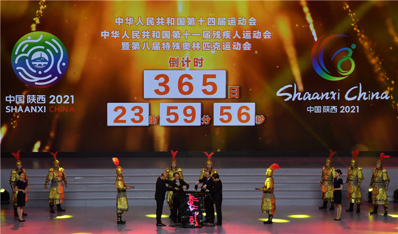 伴着VCR《全运盛会到陕西》的镜头,9月15日,第十四届全国运动会和全国第十一届残运会暨第八届特奥会开幕倒计时一周年活动在陕西西安奥体中心举行。国家体育总局局长苟仲文,中国残联理事长周长奎,陕西省委书记刘国中、省长赵一德出席活动,并共同启动十四运会和残特奥会倒计时一周年倒计时装置。十四运会和残特奥会倒计时一周年启动,标志着两个运动会筹办工作进入新阶段。