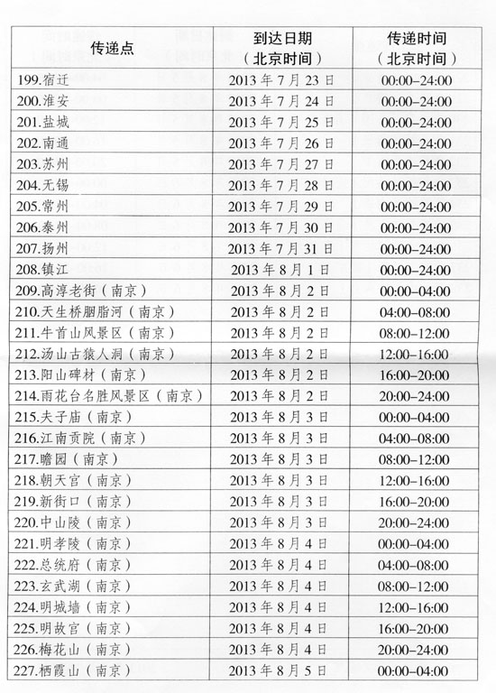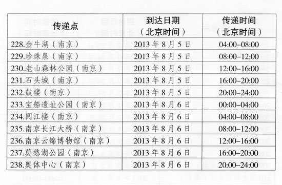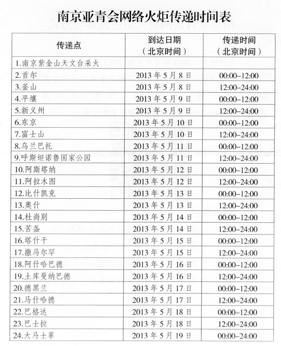 南京亚青会网络火炬传递共238个传递点,按照线路安排,网络火炬将于6月21日零点到达中国大陆第一个传递点哈尔滨市,经一个月江苏省外传递后,将于7月21日零点传至江苏省第一个传递点连云港市,再于8月2日进入亚青会举办地南京市展开传递。