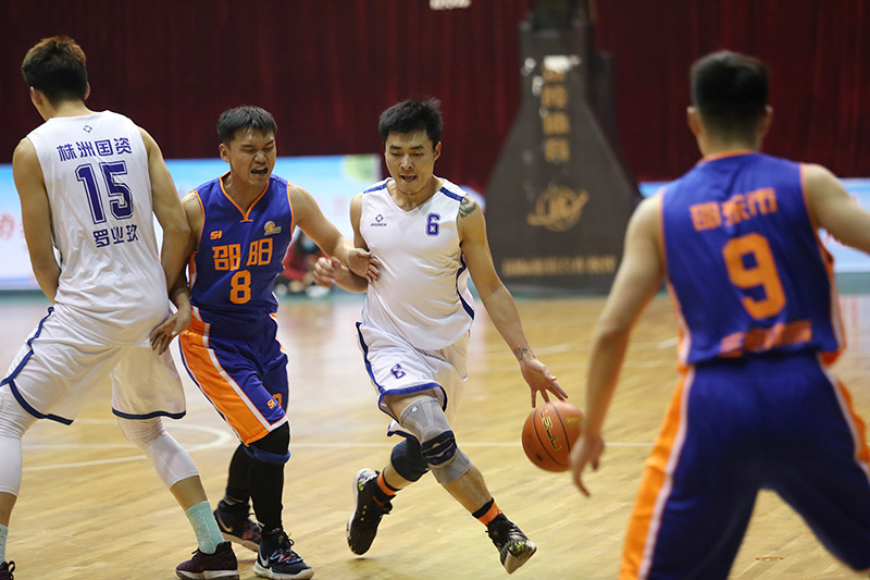 图为邵东市代表队(蓝衣)与株洲市代表队(白衣)进行的篮球揭幕战精彩瞬间。