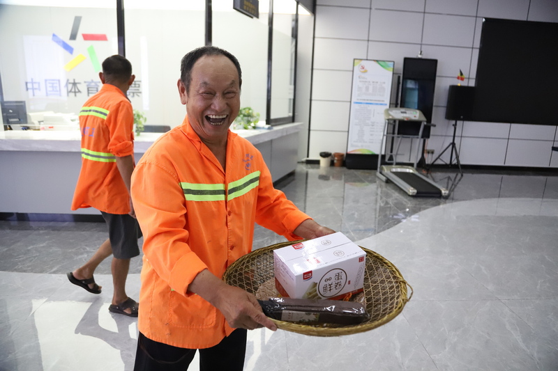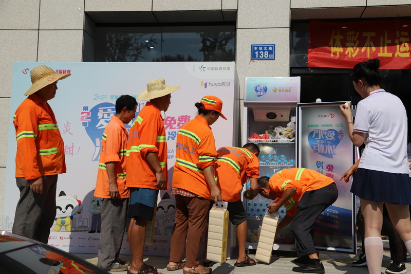 活动现场,除了爱心冰柜已有的矿泉水外,虎牙主播萌萌和木木还提前准备了水果、蔬菜,为炎炎夏日仍在辛勤工作的环卫人员献上了一份清凉,并邀请附近居民及高温工作者一起来参与全民运动的比拼,送出了公益体彩周边纪念品。