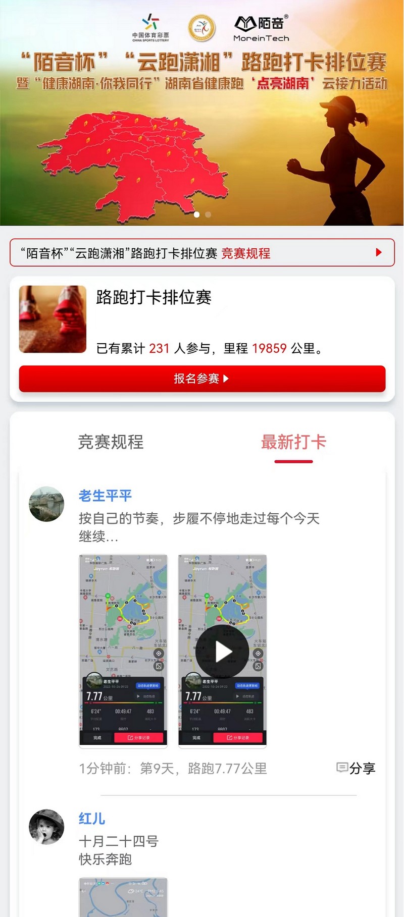 为积极贯彻落实省委省政府健康湖南建设规划,丰富广大群众参与体育活动赛道,日前,湖南省体育云动会组委会再次创新赛事模式,推出中国体育彩票·“陌音杯”湖南省第二届体育云动会“云跑潇湘”路跑打卡排位赛活动,广大市民在参赛的同时,还将与全省市民共同携手点亮“健康湖南”运动地图,共同畅游云上,体验运动带来的快乐。
