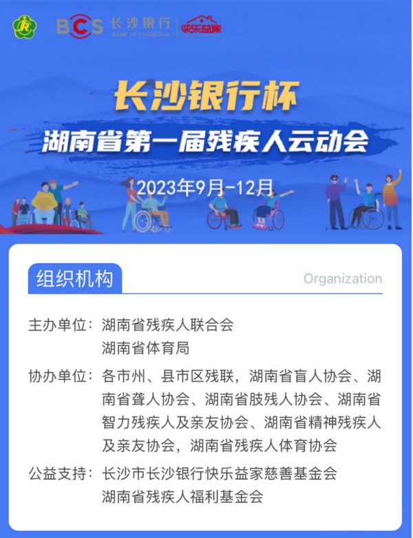 “长沙银行杯”湖南省第一届残疾人云动会由省残疾人联合会、省体育局主办,由长沙市长沙银行快乐益家慈善基金会公益支持。