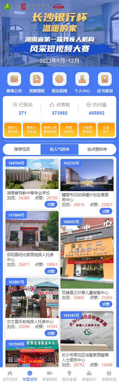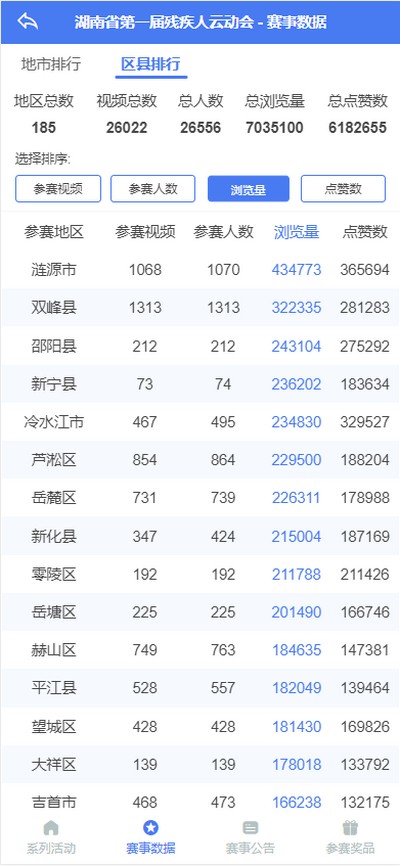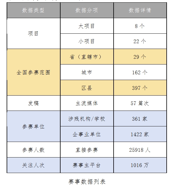赛事自9月25日启动至11月30日报名截止,吸引了来自全国29个省(直辖市)、162个城市、397个区县、1422家单位共25918人参赛,省内121个区县、271家涉残服务机构、90所特殊教育学校参与。期间,赛事新闻发布共57篇次,全国34个省份、376个城市的用户参与赛事互动,赛事主平台关注人次超1000万。