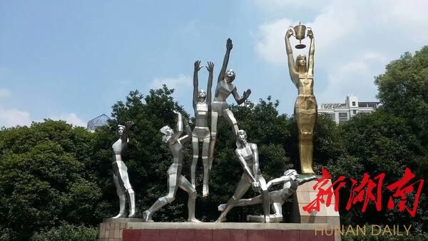 北湖公园里的中国女排五连冠雕塑。