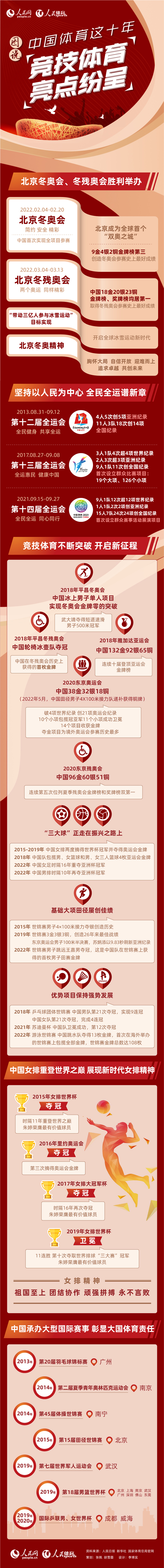 体育强则国家强,国家强则体育强。党的十八大以来,在以习近平同志为核心的党中央坚强领导下,中国体育攻坚克难、踔厉奋进,群众体育蓬勃开展、竞技体育亮点纷呈、体育产业提速发展,开启全面迈向社会主义现代化体育强国新征程。本系列图解将从群众体育、竞技体育、体育产业三方面,展示十年来中国体育事业发展取得的显著成就。