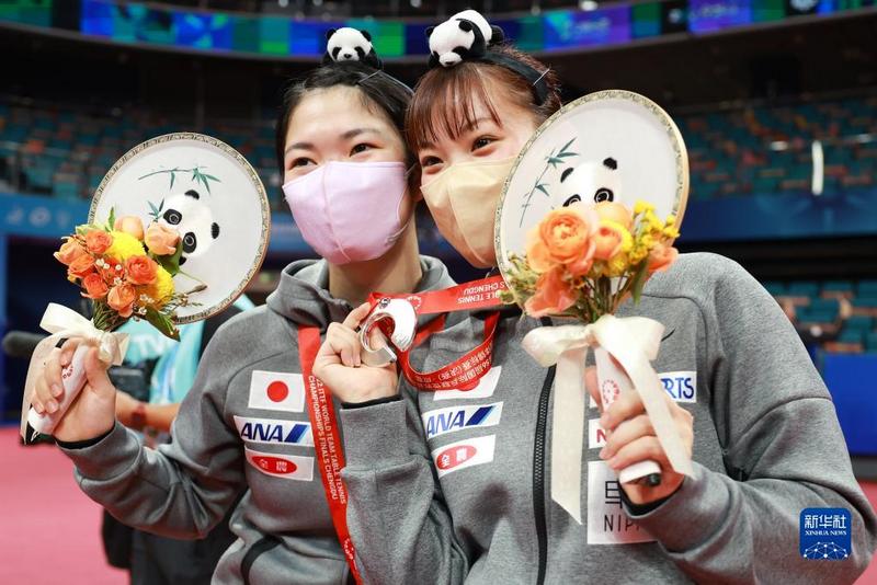 10月8日,日本队选手长崎美柚(右)、木原美悠头戴熊猫头饰在颁奖仪式后合影留念。新华社记者刘续摄