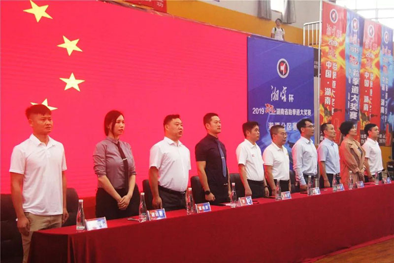湖南省跆拳道运动协会副主席冯利祥、湖南科技大学体育学院党委书记胡斌梁、湖南省跆拳道运动协会副主席兼考培部主任黄晓、湘潭市跆拳道协会会长、湘潭市跆拳道推广管理委员会会长刘爱军、湖南省跆拳道运动协会副秘书长兼竞赛部主任付元利、湘潭市跆拳道协会副会长、湘潭市跆拳道推广管理委员会副会长易琼、湘潭市跆拳道推广管理委员会秘书长何磊、副秘书长陈晋、湘窖酒业湘潭办事处主任童闽湘、大赛裁判长唐晓敏等嘉宾和领导出席了25日上午举行的开幕式。