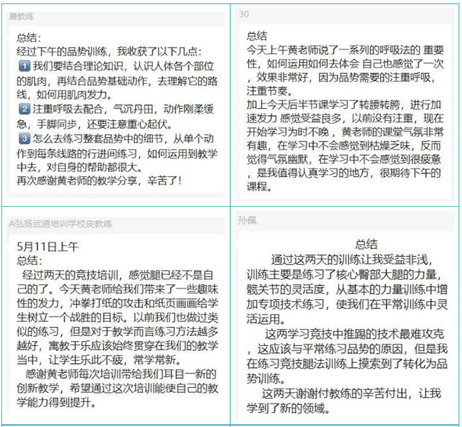 培训结束后,参训教练员们纷纷表达对培训师的认可和对湖南跆协公益下基层活动的真诚感谢。参训的何教练表示:”感谢两位老师对动作的细心讲解,每次复训都会有不一样的体会,不一样的成长,我们必须保持空杯心态继续努力前行“。陈教练认为,这次培训,接触到了很多自己不曾知道的知识,对自己往后的教学具有很大的帮助,衷心感谢两位老师的亲身示范与无私传授。