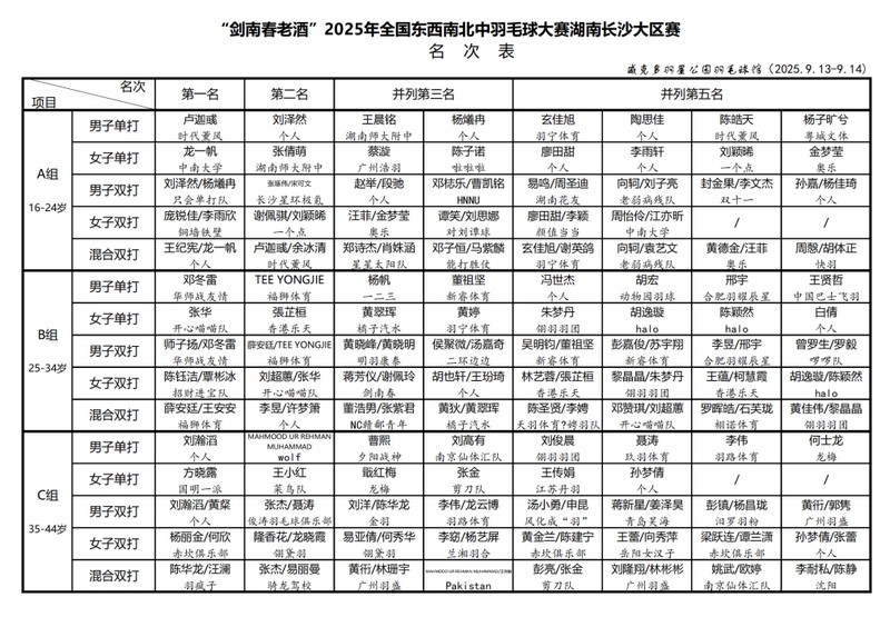 近日,“剑南春老酒”2025年全国东西南北中羽毛球大赛长沙大区赛收官,来自全国各地的近700名羽毛球爱好者经过两天紧张而激烈的角逐,7个组别29个单项冠军全部诞生。