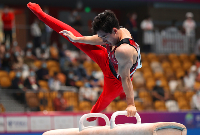 鞍马比赛中的张博恒。摄影/陈杰