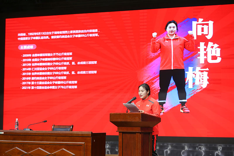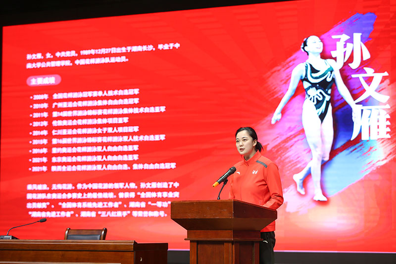 里约奥运会举重冠军向艳梅,连续三届奥运会花样游泳银牌得主、全运会冠军孙文雁,湖南省跆拳道队主教练晏营先后宣讲,分享了个人运动员生涯中的高光时刻,训练过程中的艰苦与辛酸和培养运动员的体验感悟。